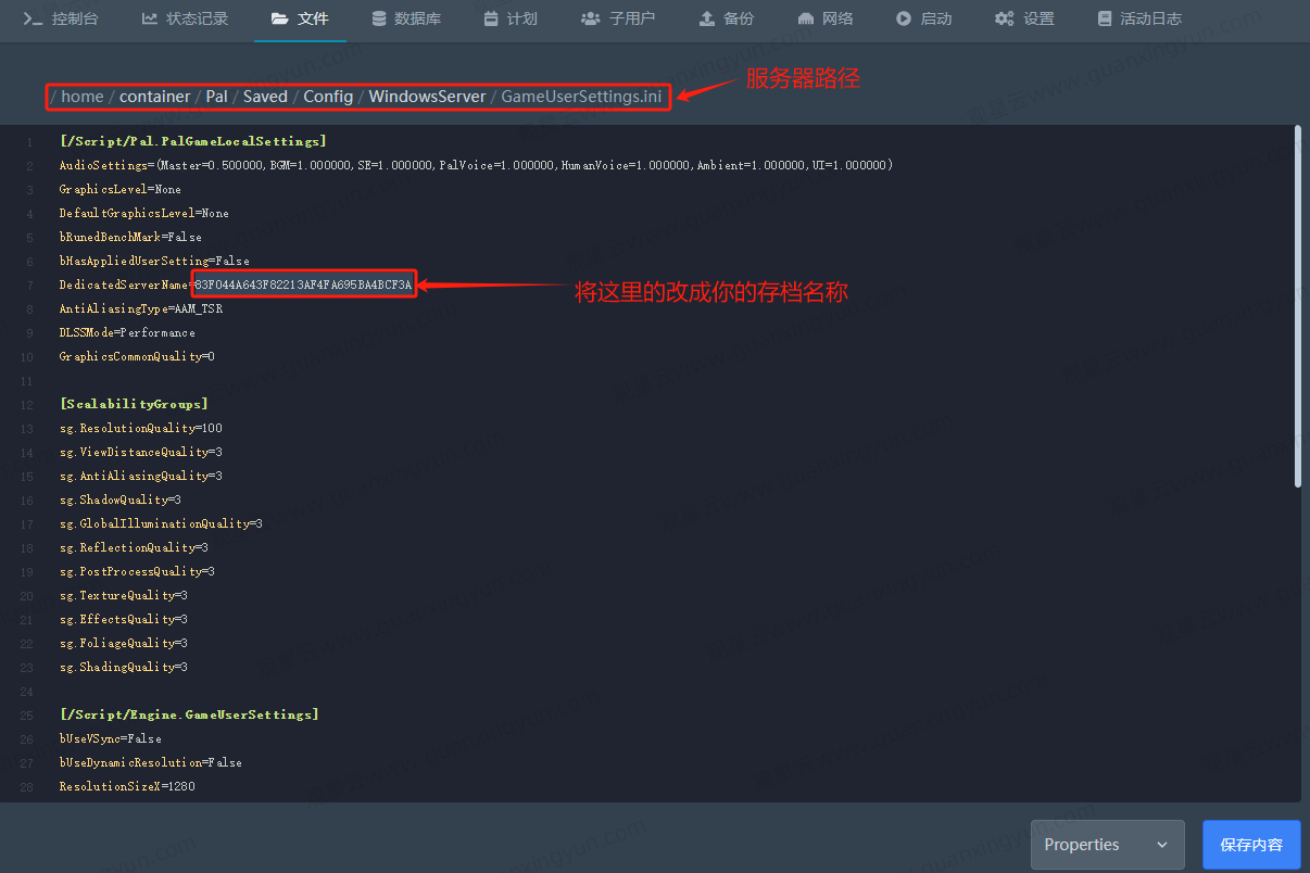 服务器路径:/home/container/Pal/Saved/Config/WindowsServer/GameUserSettings.ini